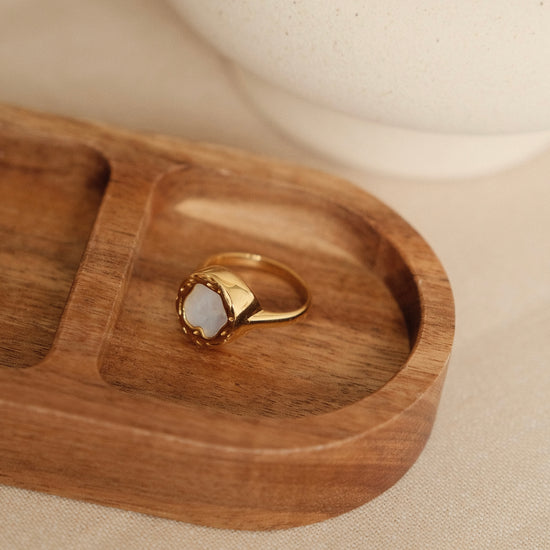 The "Moonshadow Ring" is a captivating piece that echoes the gentle luminescence of moonlight upon the tranquil sea.